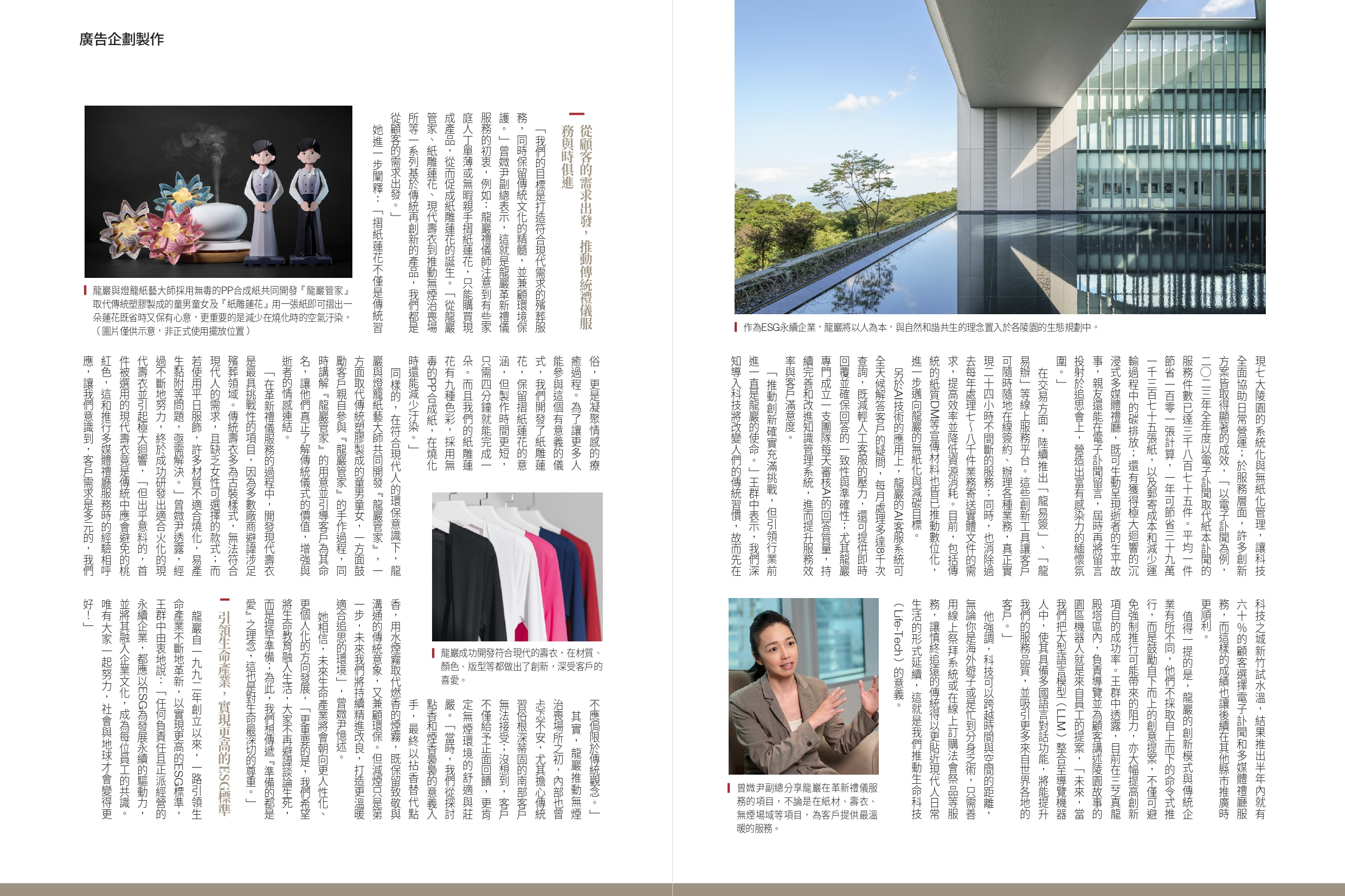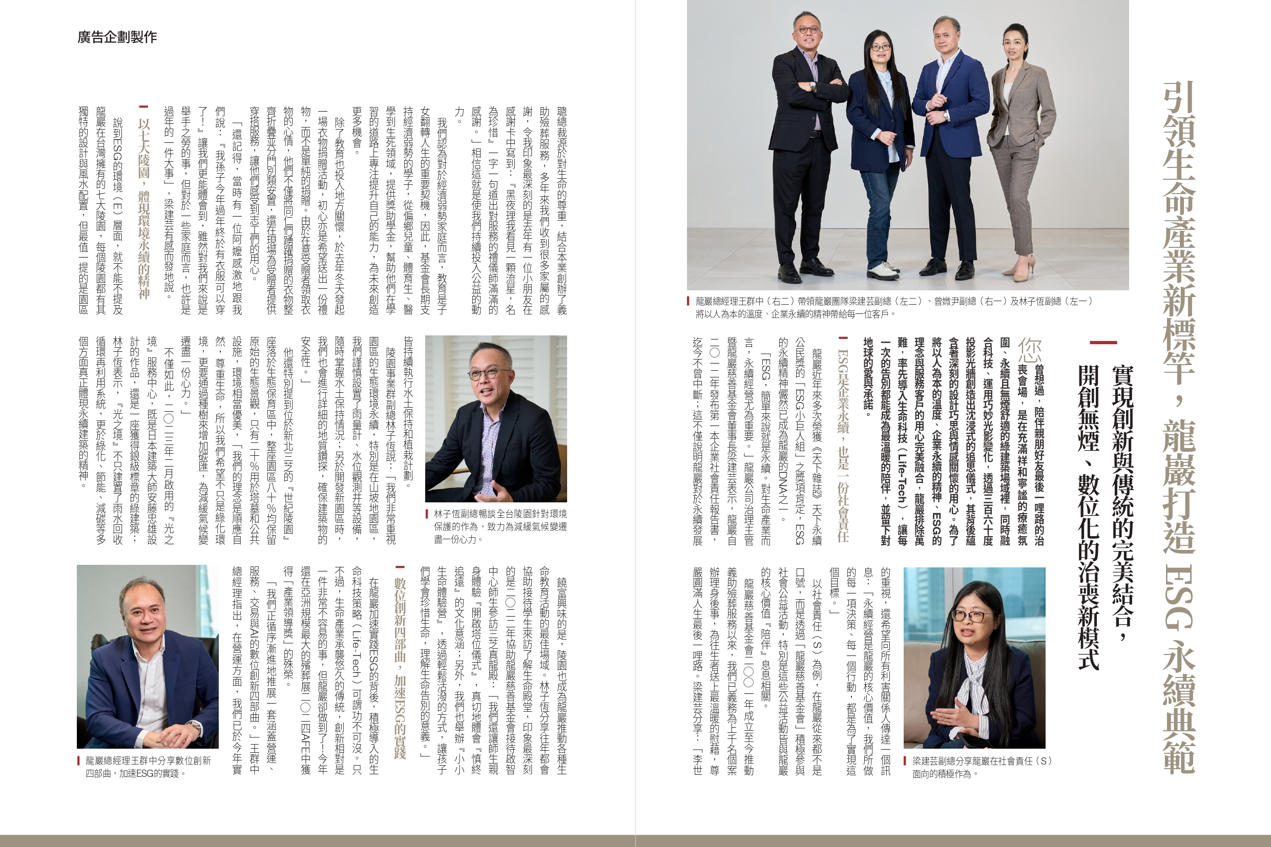 為了讓廣大民眾能了解龍巖辛勤耕耘的成果,受邀分享龍巖對於ESG企業永續發展之經營成果的報導:引領生命產業新標竿,龍巖打造ESG永續典範,邀請到王群中總經理分享近年來數位創新、梁建芸副總分享公司治理與社會責任、林子恆副總分享陵園環境保護作為以及曾媺尹副總暢談禮儀服務創新改良等,持續樹立業界領先及專業品牌之形象。