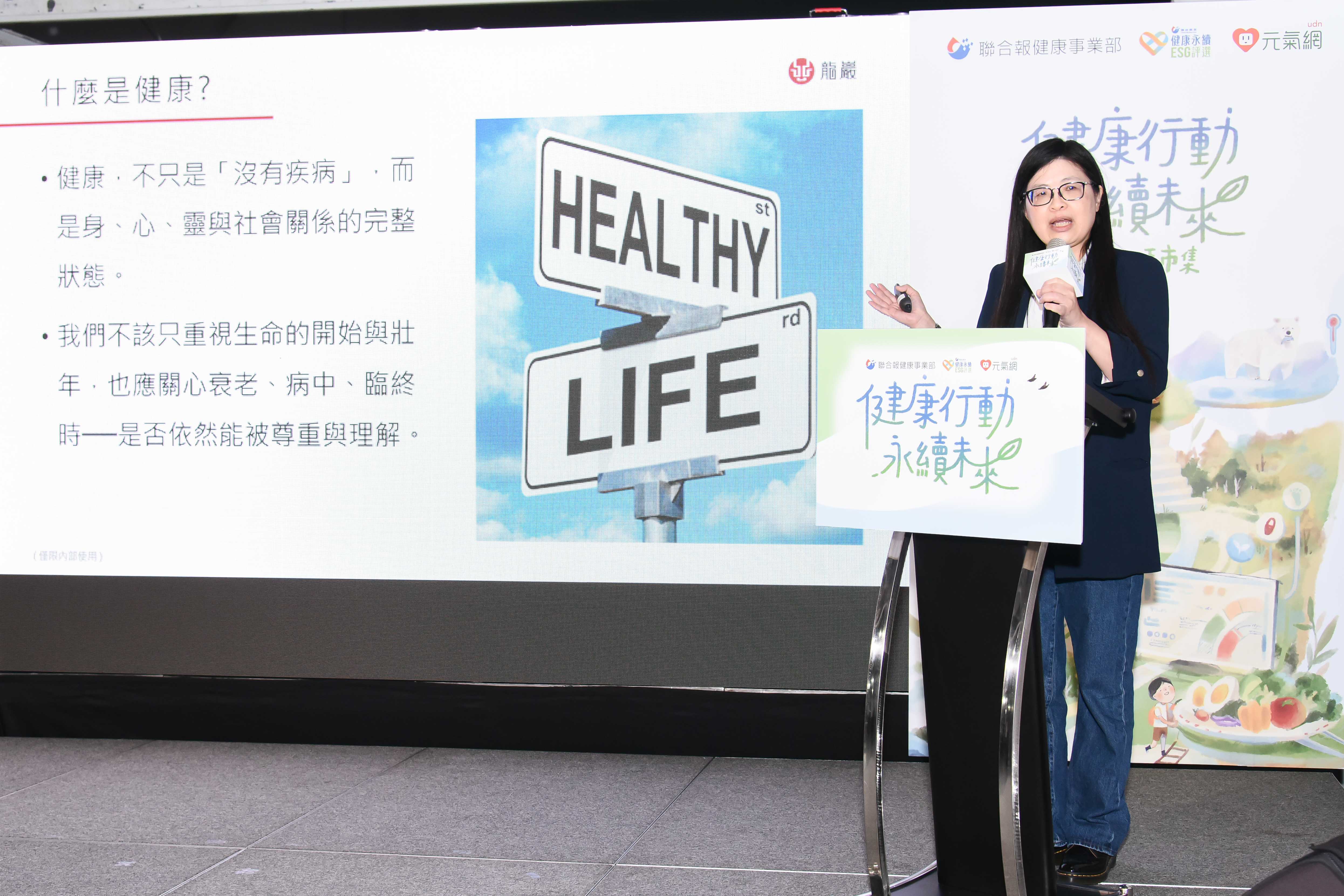 龍巖公司治理梁建芸副總經理以「健康不只是沒有疾病,而是身、心、靈與社會關係的完整狀態。」為切入點,闡述健康永續的真正意涵。她進一步分享,善終很重要,但更重要的是把善終的概念向前延伸至日常生活的「健康永續」。