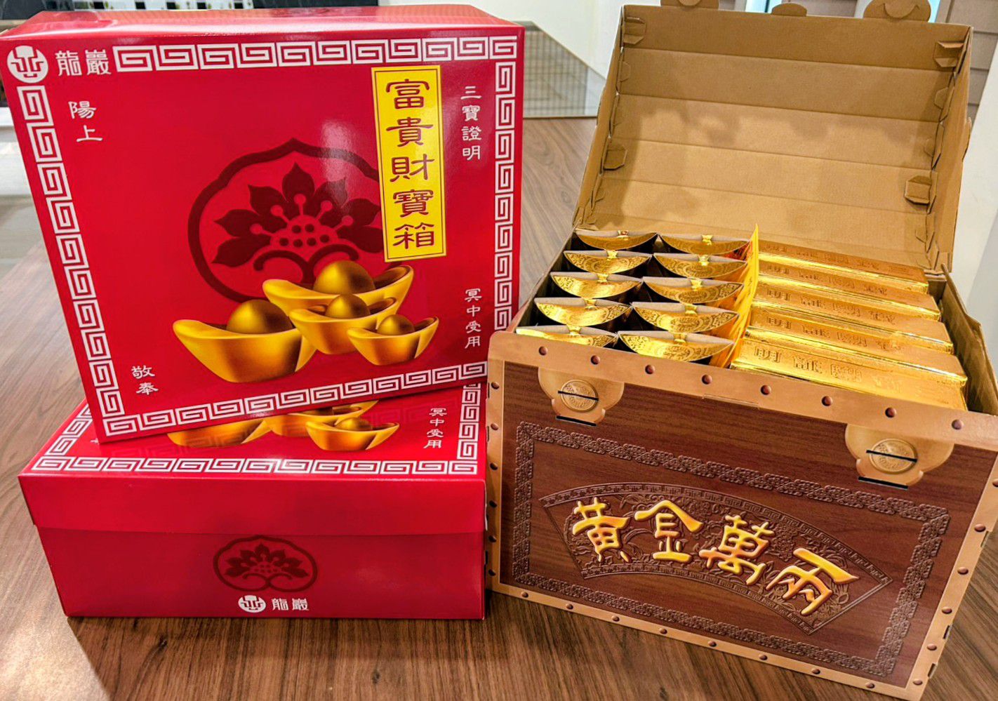 紙紮金銀與元寶象徵財富與祝福,是喪禮中不可或缺的供品。現代紙紮金銀的材質與造型更加精緻,常見有金條、存摺、保險箱、金庫或金磚等多樣樣式,紙面使用燙金膜與鏡面反光技術,展現尊榮與誠意。家屬可依照親人信仰與生活背景挑選適合的財寶造型,例如企業家可準備紙紮金庫,長輩可用金銀元寶,寓意「福祿壽全、富貴長存」。