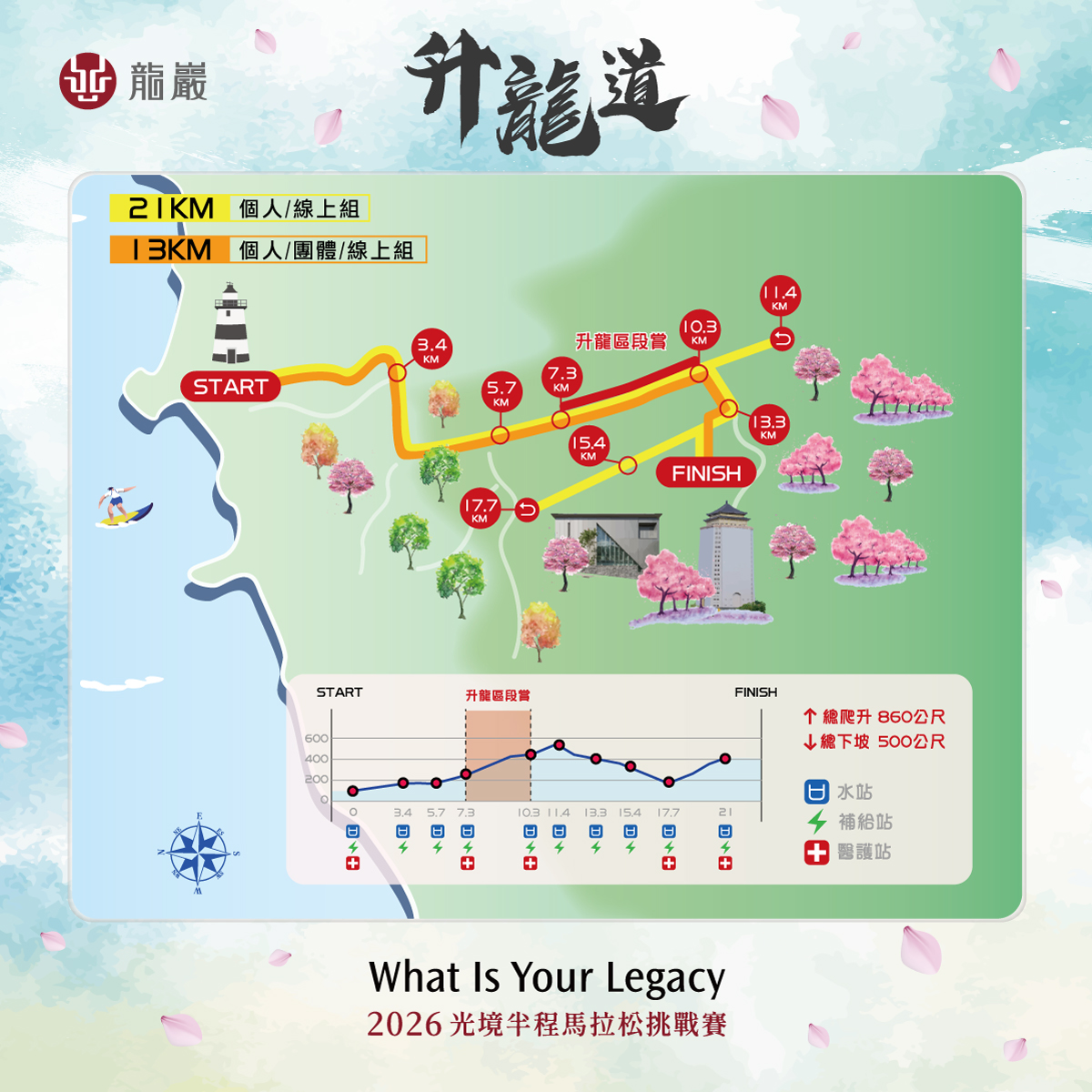 「2026光境半程馬拉松挑戰賽-升龍道」賽道全長21.0975公里,總爬升達860公尺,從位於海邊的石門富貴角燈塔停車場出發,一路沿著花卉茶園交錯的林道秘境上升,途中經過全新完工的石門珊瑚貝殼廟,再穿越由李天鐸、王俠軍、唐忠漢、楊奉琛、楊柏林等眾多台灣知名藝術巨擘聯合參與打造的龍巖藝術園區,再抵達日本建築大師安藤忠雄設計的終點「光之境服務中心」。
