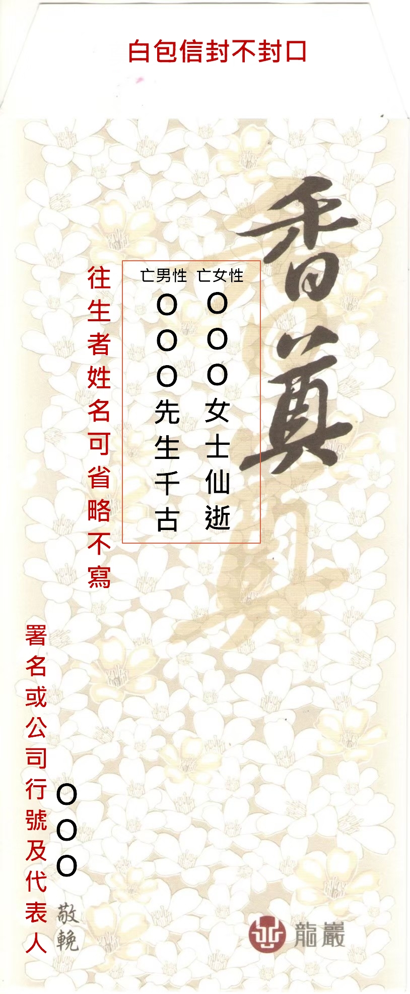 | 署名 | 白包左下位置署名,若為公司行號可寫上完整的公司名稱及代表人職稱與姓名 |