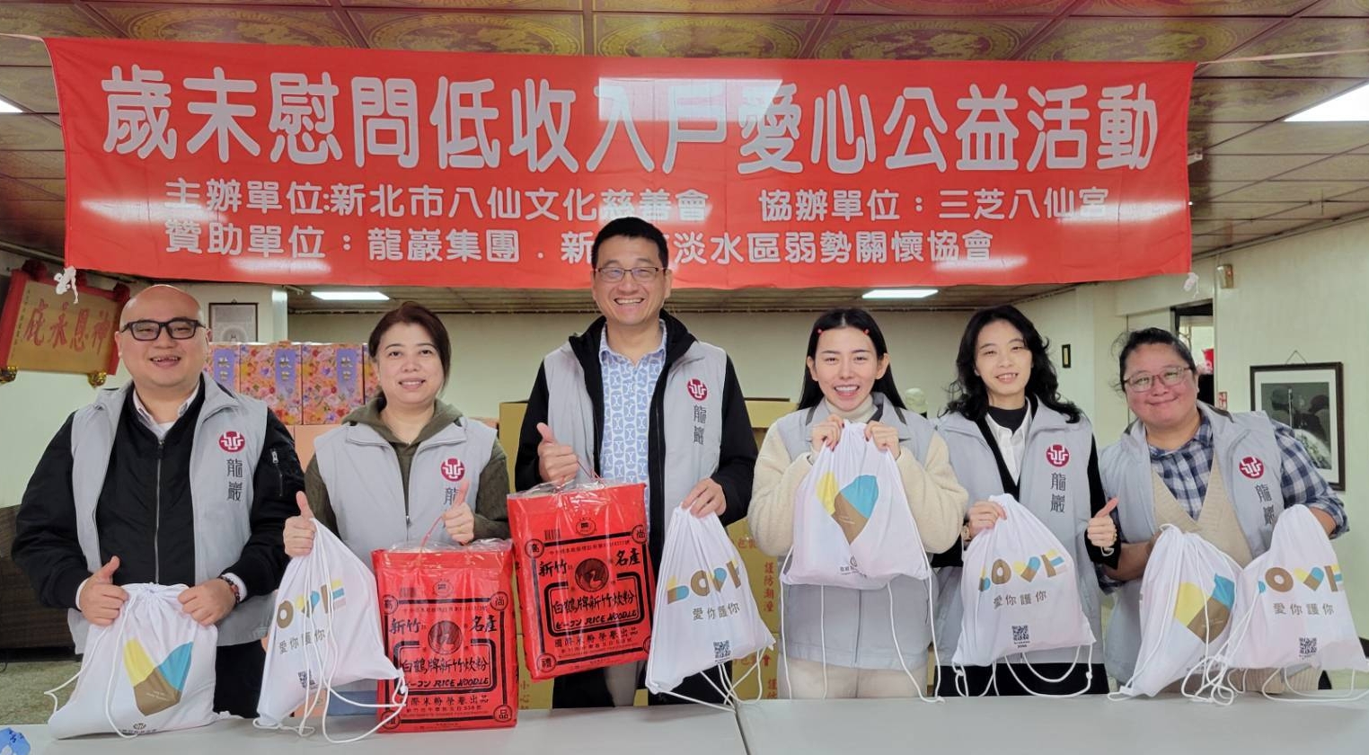 八仙宮是三芝在地居民信仰的廟宇,長年舉辦「歲末年終慰問低收入戶愛心公益活動」。龍巖三芝白沙灣陵園自 14 年前加入捐款及物資贊助八仙宮辦理此活動。今年活動於 115 年 2 月 1 日 舉行,龍巖延續傳統號召員工自發性成立的龍巖志願服務隊,投入志工行列,陪伴三芝地區的低收入長者並將溫暖與祝福送到鄰里家庭。