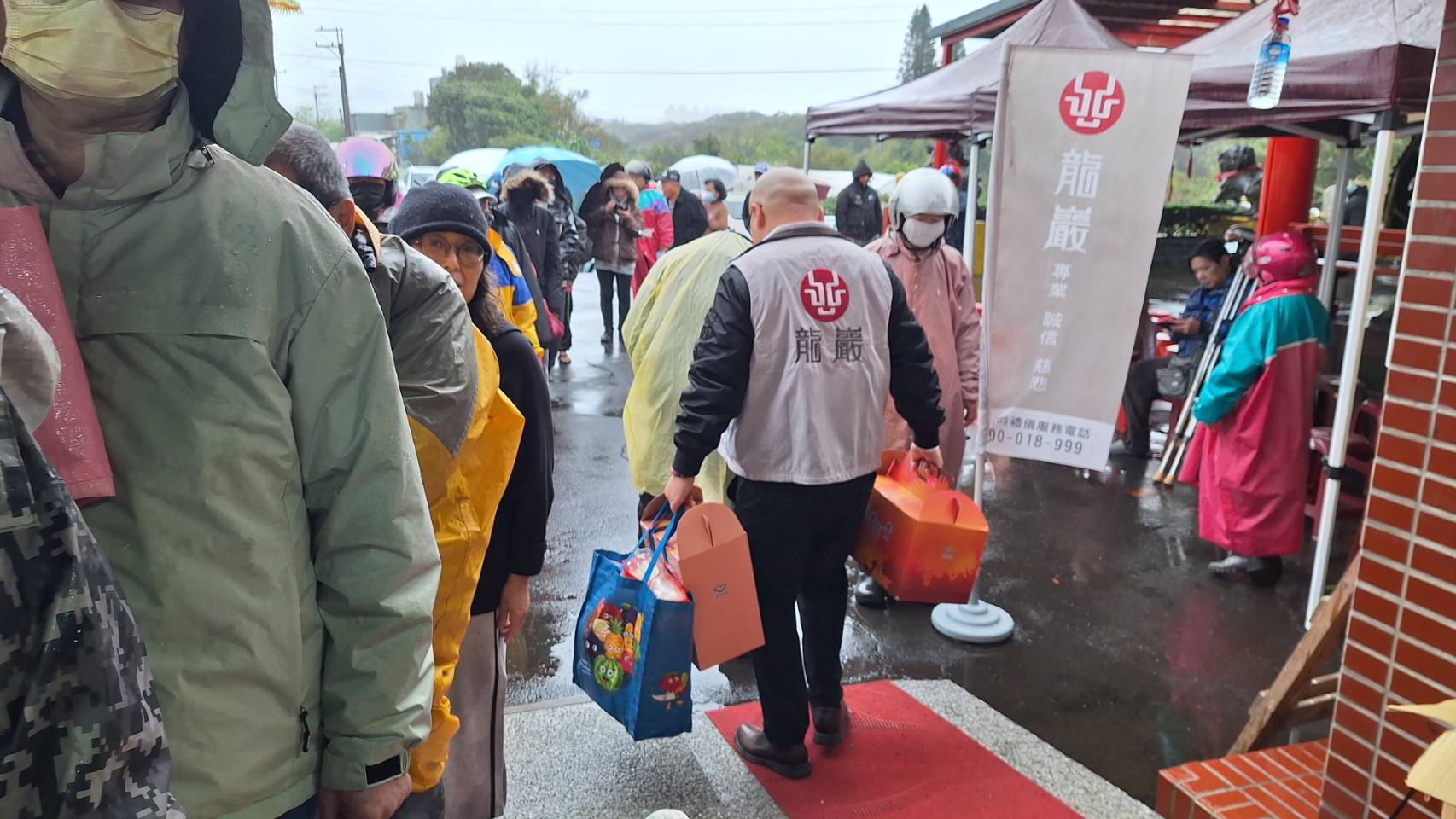 圖說: 由於當天下雨避免凌亂,志工們耐心引導長輩依序排隊確保發放秩序順暢,並協助行動不便的長輩提領物資。